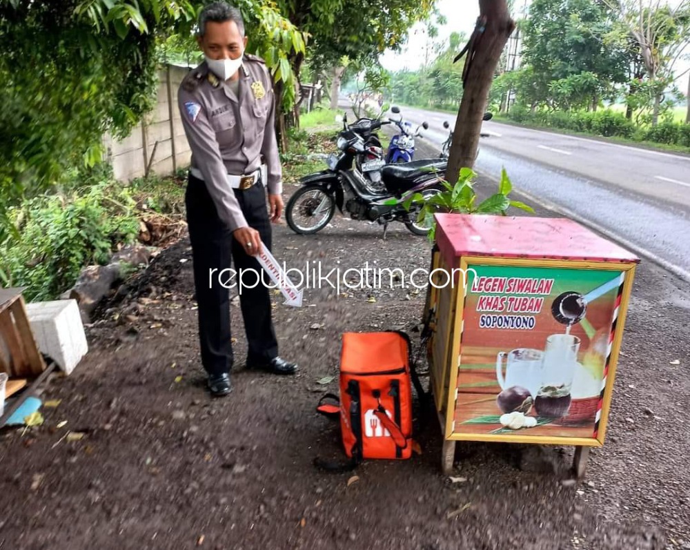 Kotak jasa pengantar makanan itu ditaruh oleh pelaku di dekat stan penjual es legen yang berada di kawasan jalur Lingkar Timur, Sidoarjo.