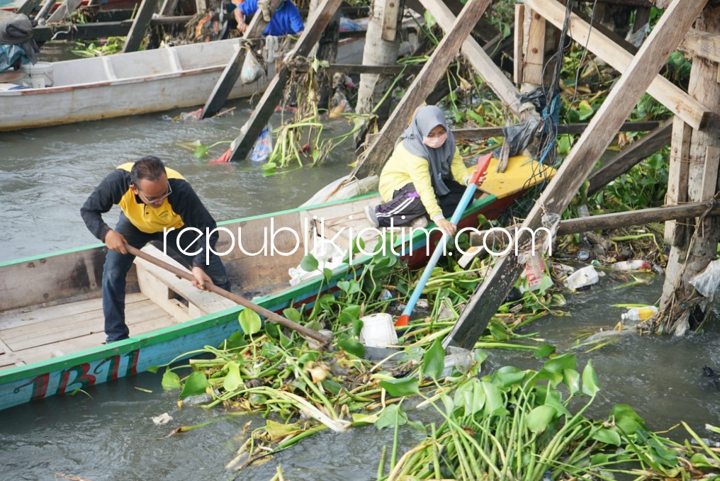 Sidoarjo (republikjatim.com) - Sungai Buntung di perbatasan Desa Segorotambak, Kecamatan Sedati dan Desa Tambakoso, Kecamatan Waru akhirnya dinormalisasi, Minggu (19/12/2021). Wakil Bupati (Wabup) Sidoarjo, Subandi ikut turun langsung bersama warga sekitar gotong-royong membersihkan tanaman enceng gondok.