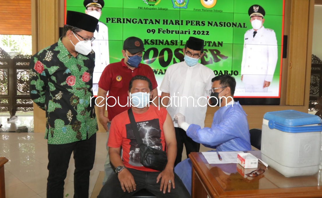 Sidoarjo (republikjatim.com) - Untuk memperingati Hari Pers Nasional (HPN) Tahun 2022, wartawan se Sidoarjo yang tergabung dalam Persatuan Wartawan Indonesia (PWI) dan Forum Wartawan Sidoarjo (Forwas) bersama Pemkab Sidoarjo menggelar vaksinasi booster di Pendopo Delta Wibawa, Rabu (09/02/2022). Vaksinasi bagi puluhan wartawan ini, lantaran selama ini wartawan dan kru media menjadi garda terdepan dalam pemberitaan soal pandemi Covid-19.
