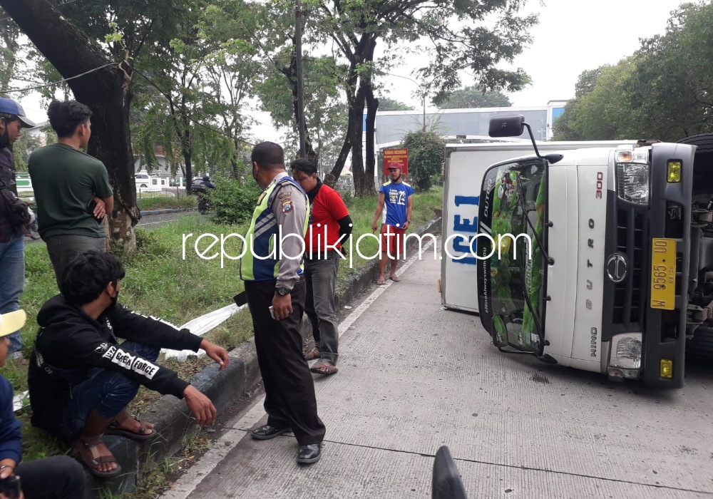 Ban Tegelincir Karena Licin, Truk Box Ice Cream Terguling di JL Raya Juanda Sidoarjo