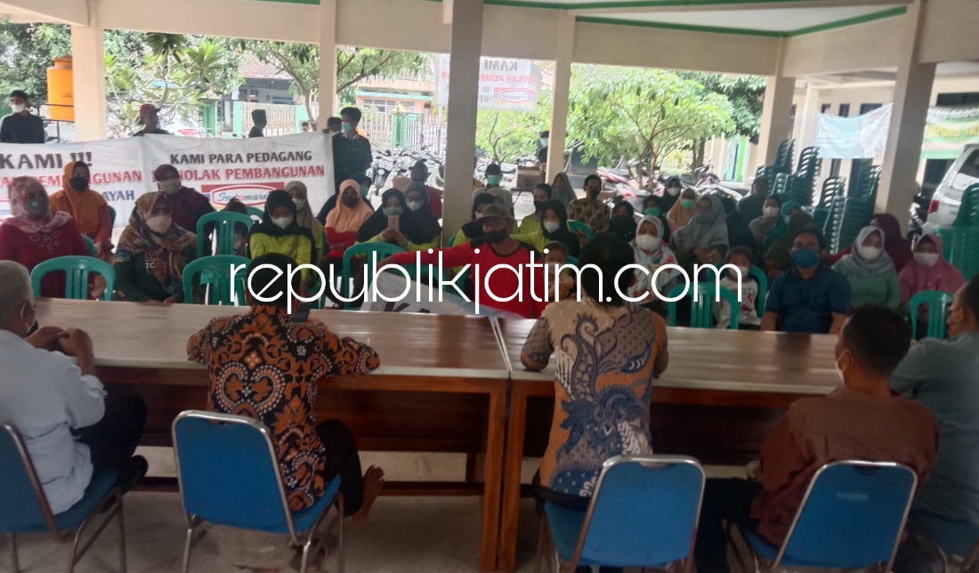 Sidoarjo - (republikjatim.com) - Puluhan pedagang toko kelontong dan pracangan yang didominasi emak-emak (ibu-ibu rumah tangga) warga Desa Tambakrejo, Kecamatan Krembung, Sidoarjo meluruk balai desa setempat, Selasa (01/03/2022). Mereka memrotes pembangunan minimarket di kampungnya.
