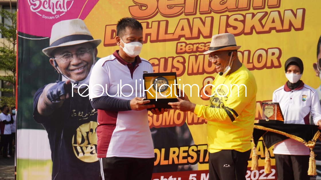 Sidoarjo (republikjatim.com) - Olahraga Sabtu Ceria di Polresta Sidoarjo kali ini berbeda dari biasanya. Kapolresta Sidoarjo, Kombes Pol Kusumo Wahyu Bintoro beserta anggota dan jajarannya mengikuti senam bersama dengan instruktur mantan Menteri BUMN, Dahlan Iskan (DI).