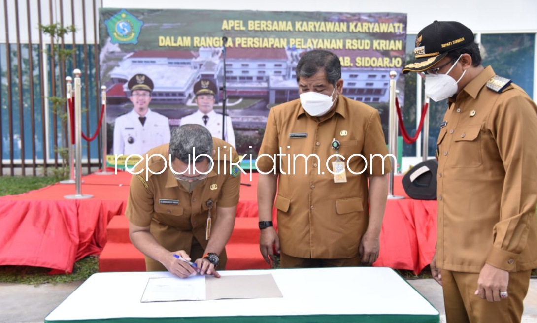 Sementara dalam kesempatan itu juga dilakukan serah terima RSUD Sidoarjo Barat oleh Kepala Dinas Kesehatan, drg Syaf Satriawarman Sp Pros kepada Plt Direktur RSUD Krian dr Abdillah Segaf Alhadad yang disaksikan Bupati Muhdlor. Zak/Hel/Waw