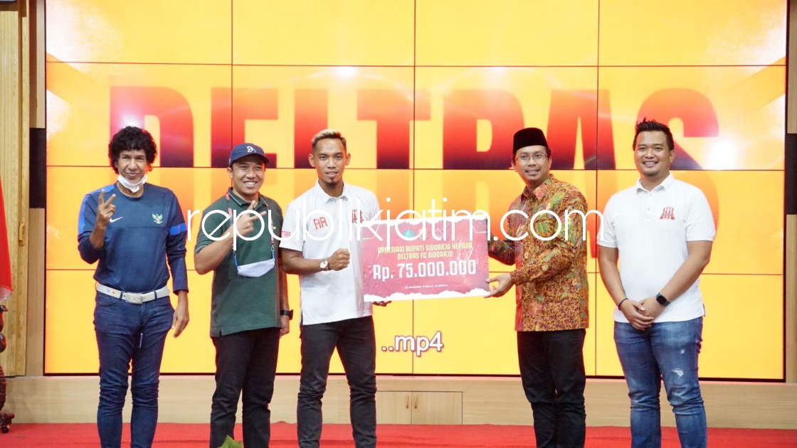 Sidoarjo (republikjatim.com) - Apresiasi tinggi diberikan Bupati Sidoarjo, Ahmad Muhdlor Ali (Gus Muhdlor) kepada para pemain dan tim official Deltras FC yang lolos ke Liga 2 setelah mengalahkan Persedikab Kediri. Bonus berasal dari kantong pribadi Bupati Sidoarjo ini secara simbolis diserahkan ke Kapten Tim, Aulia Ardli yang merupakan Arek Sidokerto, Kecamatan Buduran dalam acara Syukuran Kulonuwun Liga 2 Deltras FC di Pendopo Delta Wibawa, (13/03/2022) malam.