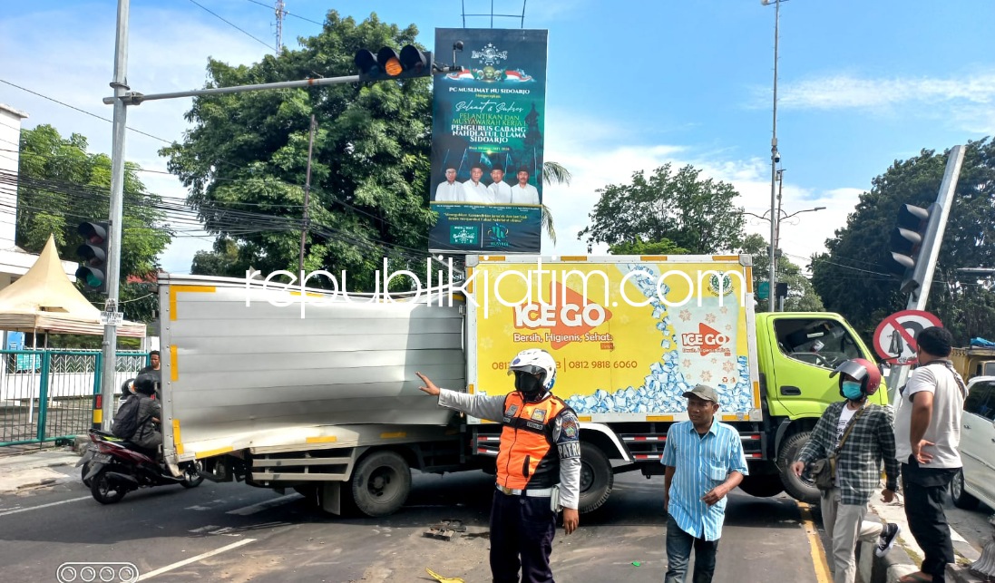 Sidoarjo (republikjatim.com) - Tabrakan beruntun terjadi di JL Raya Pucang, Kecamatan Sidoarjo, Rabu (16/03/2022) sore. Dalam kecelakaan di depan MINU Sidoarjo itu melibatkan tiga kendaraan sekaligus. Diantaranya dua truk box dan sepeda motor hingga traffic light (lampu merah) di pertigaan Pucang itu.