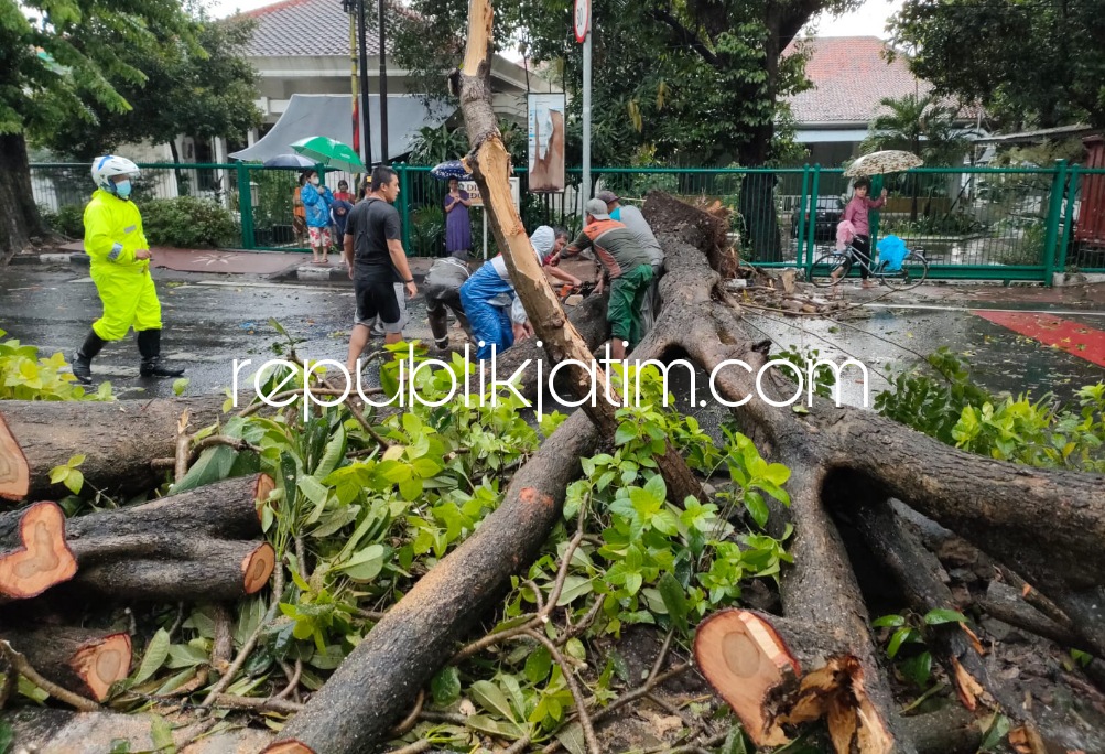 Sidoarjo (republikjatim.com) - Tumbangnya dua pohon perindang yang ada di JL A Yani, Kelurahan Pucang (di depan SDN Pucang I dan JL Majapahit, Celep, Kelurahan Sidowayah, Kecamatan Sidoarjo (depan toko Oleh-Oleh Miitra) tidak hanya merusak dua mobil dan satu unit motor pengguna jalan. Akan tetapi, bencana alam itu juga menyebabkan dua korban terluka dilarikan ke RSUD Sidoarjo.