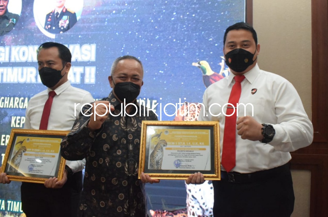 Wiratno menyerahkan piagam penghargaan itu, kepada Wakapolda Jatim Brigjen Pol Slamet Hadi Supraptoyo mewakili Kapolda Jatim. Selain itu, sejumlah pejabat utama (PJU) Polda Jatim, Ditreskrimsus Polda Jatim, Kapolresta Sidoarjo dan Kasat Reskrim Polresta Sidoarjo. Penghargaan diberikan atas komitmen Polda Jatim dalam upaya melindungi Sumber Daya Alam dan Ekosistem di Jawa Timur. Yakni melalui penegakan hukum terhadap para pelaku yang melakukan peredaran penjualan Tumbuhan dan Satwa Liar (TSL).