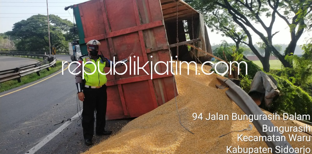 "Kasus laka tunggal truk gandeng di Exit Tol Waru arah Medaeng itu, tidak ada korban jiwa. Tapi muatan truk gandeng semua tumpah," ujar Kanit Laka, Satuan Lantas, Polresta Sidoarjo, AKP Sugeng Sulistyono kepada republikjatim.com, Rabu (23/03/2022).