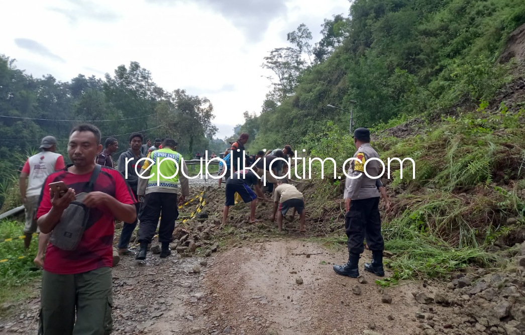 Ponorogo (republikjatim.com) - Hujan lebat yang terjadi Sabtu (26/03/2022) sekitar pukul 13.20 - 15.30 WIB kemarin, mengakibatkan tanah longsor di Desa Wates, Kecamatan Slahung, Ponorogo. Tebing setinggi 15 meter dan panjang 20 meter ambrol menimpa badan jalan raya Nasional III Ponorogo - Pacitan di KM 226 itu.