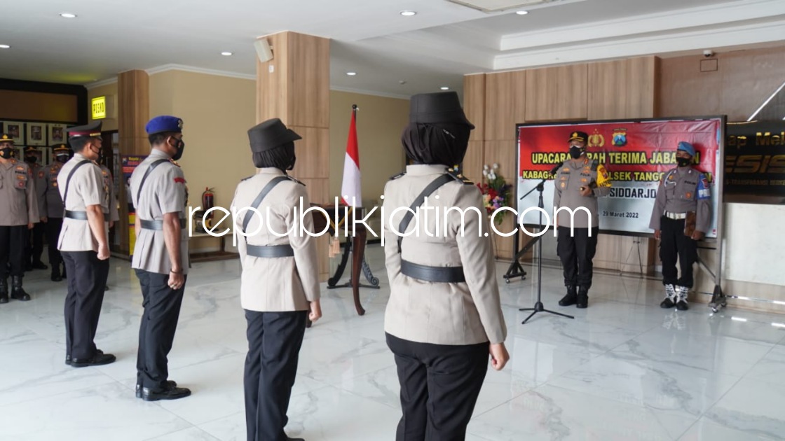 Sidoarjo (republikjatim.com) - Kapolresta Sidoarjo Kombes Pol Kusumo Wahyu Bintoro memimpin serah terima jabatan (sertijab) Kabagren Polresta Sidoarjo dan Kapolsek Tanggulangin di ruang lobi Polresta Sidoarjo, Selasa (29/03/2022).