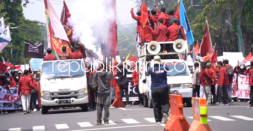 Sidoarjo (republikjatim.com) - Ratusan mahasiswa Universitas Muhammadiyah Sidoarjo (Umsida) meluruk kantor DPRD Sidoarjo. Mereka menggelar unjuk rasa di depan kantor Gedung DPRD Sidoarjo, Selasa (12/04/2022).