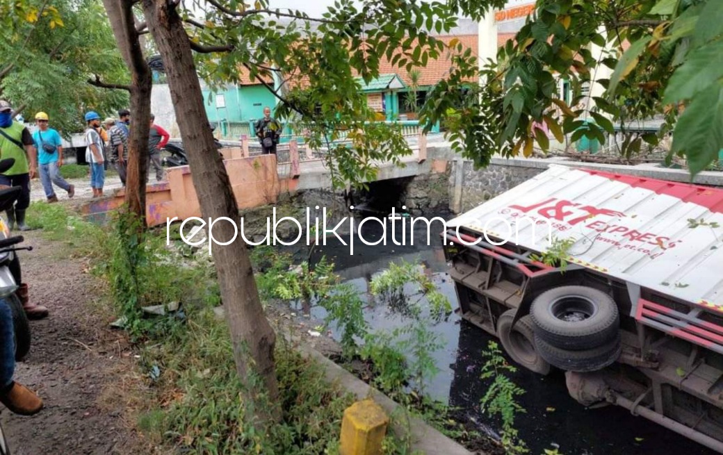 Sidoarjo (republikjatim.com) - Sebuah truk box ekspedisi bernopol L 9646 CJ yang dikemudikan Muhamad Ainun Hardiyanto (40) warga Simo Kwagean Buntu, Kota Surabaya bernasib apes. Truk milik jasa ekspedisi ternama ini, terbalik di Sungai Depan SDN Trosobo 2 Kecamatan Taman, Sidoarjo, Sabtu (16/04/2022) sore.