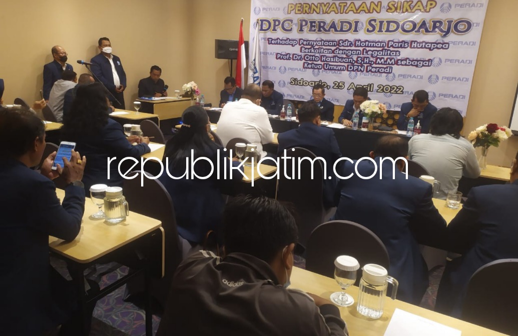 Untuk menunjukkan loyalitas itu, DPC Peradi Sidoarjo menyampaikan pernyataan sikap dihadapan kru media serta anggota dan pengurus Peradi Sidoarjo di ruang pertemuan Bougenville, Fave Hotel Sidoarjo, Senin (25/04/2022). Dalam pertemuan itu, dihadiri seluruh pengurus dan anggota DPC Peradi Sidoarjo.