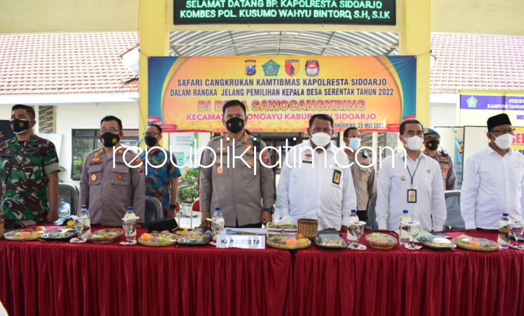 Sidoarjo (republikjatim.com) - Sejumlah Calon Kepala Desa (Cakades) dari sembilan desa di Kecamatan Wonoayu, yang melaksanakan Pemilihan Kepala Desa (Pilkades) serentak, berkumpul di Balai Desa Sawocangkring, Kecamatan Wonoayu, Sidoarjo, Jumat (20/05/2022). Para Cakades itu mengikuti Cangkrukan Kamtibmas bersama Kapolresta Sidoarjo Kombes Pol Kusumo Wahyu Bintoro.