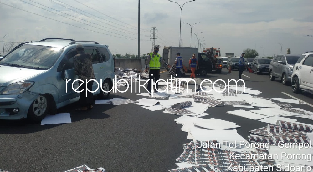 "Semula kedua mobil melaju dari arah Porong menuju Japanan. Kemudian mobil pikup box di lajur tengah dan mobil Daihatsu Xenia di lajur kanan. Sesampainya di KM 766/A, mobil pikup box ban kanan belakang mengalami pecah. Akibatnya mobil box oleng dan menabrak mobil Daihatsu Xenia di lajur kanan hingga mobil pikup box terguling dan muatan tumpah semua itu," tegasnya.