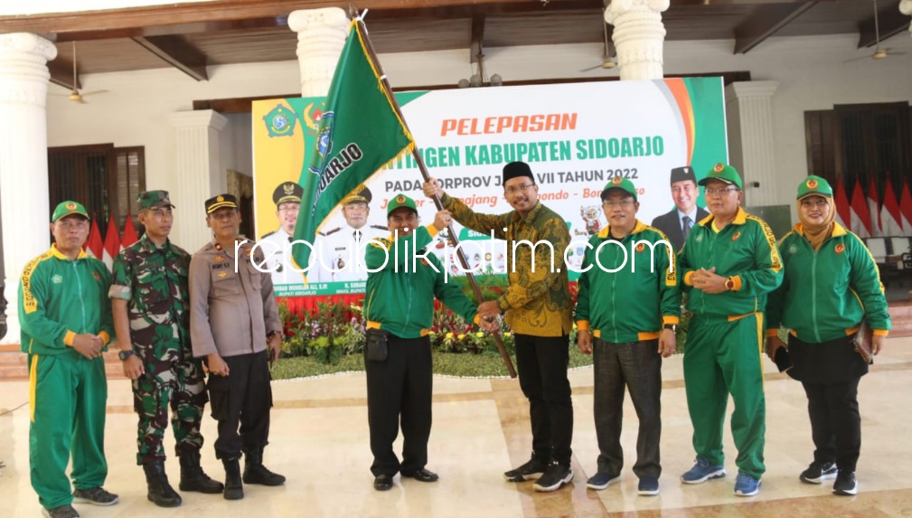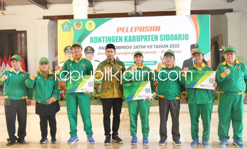 Sidoarjo (republikjatim.com) - Bupati Sidoarjo, Ahmad Muhdlor Ali memberangkatkan dan melepaskan Kontingen KONI Kabupaten Sidoarjo untuk berlaga dalam Pekan Olahraga Provinsi (Porprov) Jawa Timur ke 7 Tahun 2022 di Pendopo Delta Wibawa, Sidoarjo, Minggu (19/06/2022).
