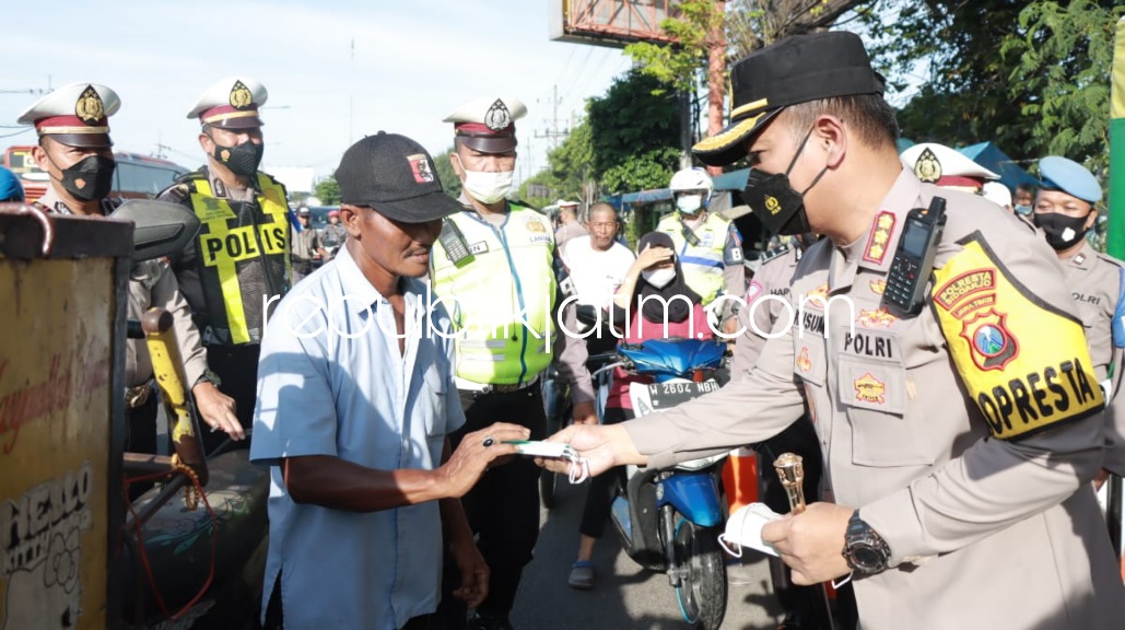 Para petugas Polresta Sidoarjo secara humanis merazia pengendara yang belum disuntik vaksin Covid-19. Selain itu, pengendara motor yang tidak memakai helm, diberi helm SNI gratis.
