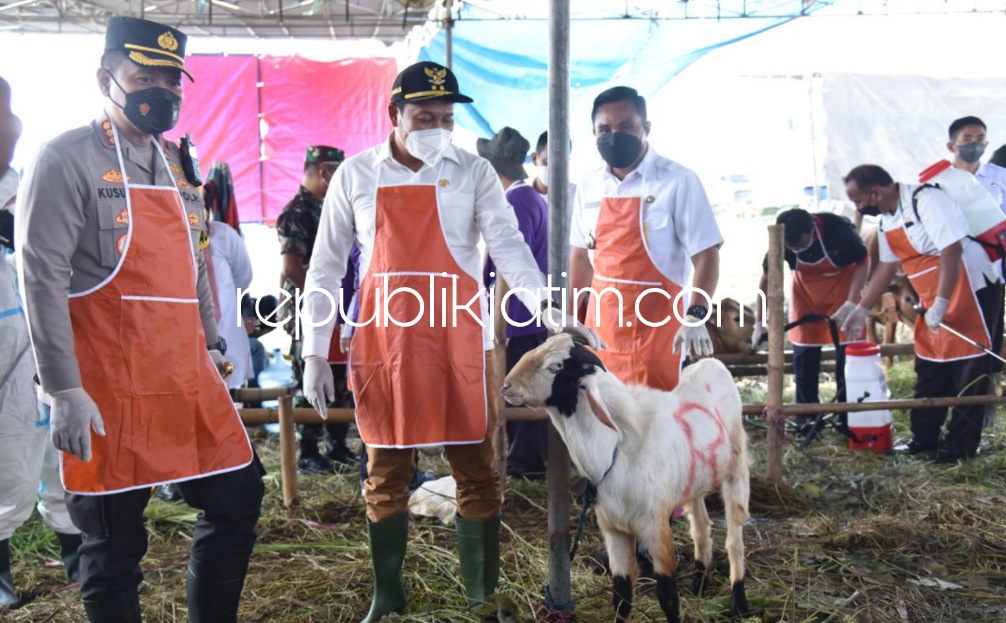 Hewan kurban yang dijual di belasan lapak itu dipantau kesehatannya oleh Dinas Pangan dan Pertanian, Pemkab Sidoarjo. Salah satu lapak resmi penjualan hewan kurban Kecamatan Waru di Sidak Forkopimda Sidoarjo, Rabu (06/07/2022).
