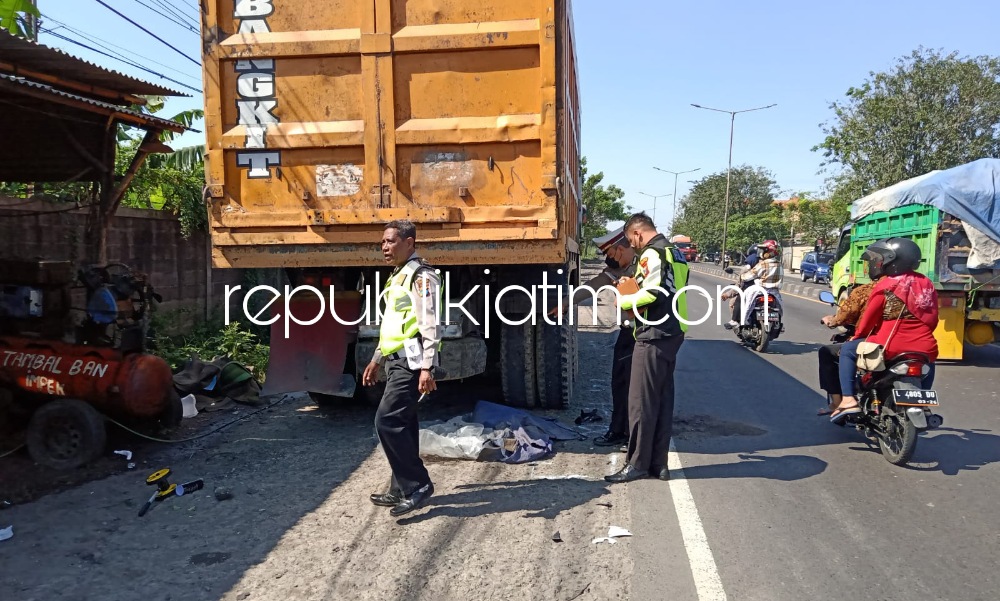 Sidoarjo (republikjatim.com) - Kecelakaan maut di JL Raya Mojokerto - Surabaya, Desa Trosobo, Kecamatan Taman, Sidoarjo, Sabtu (16/07/2022). Dalam kecelakaan melibatkan dump truk dan motor Honda Win itu menyebabkan pengendara motor tewas di lokasi kejadian. Sedangkan rekannya yang dibonceng mengalami luka-luka.