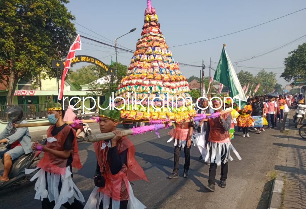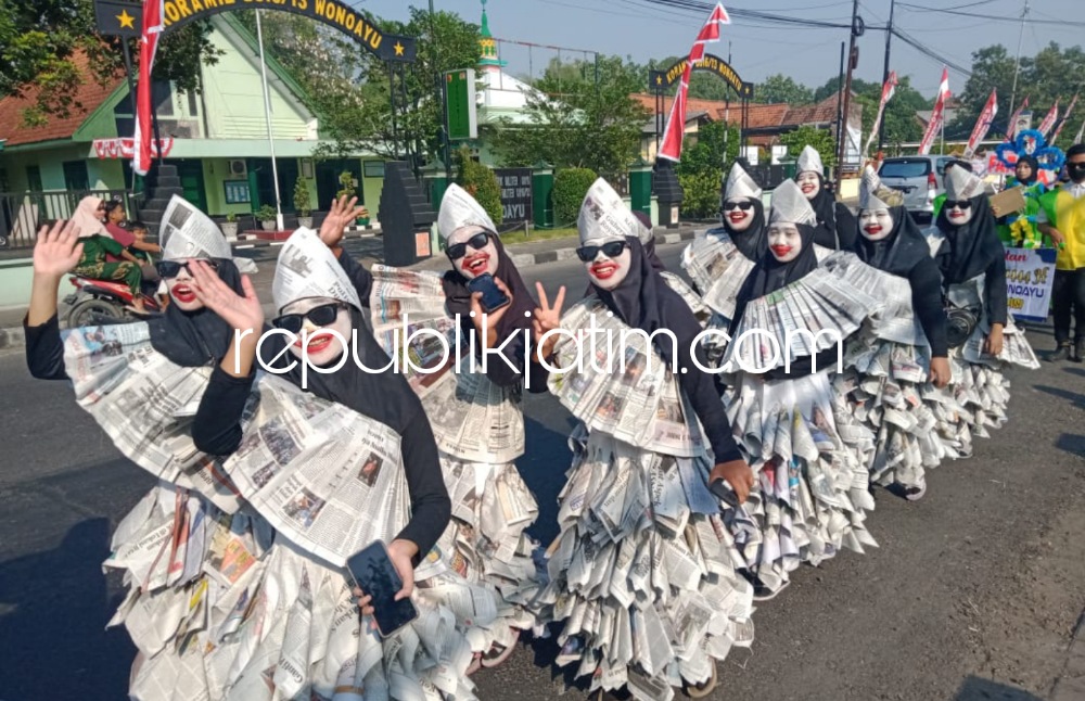 Sidoarjo (republikjatim.com) - Para guru beserta siswa dan siswi SMK YPM 11 dan MTs 1 Wonoayu menyambut Tahun Baru Islam 1444 Hijriyah. Mereka menggelar carnaval dan pawai budaya menggunakan pakaian serba hasil kreasi seni memanfaatkan limbah kertas dan plastik.