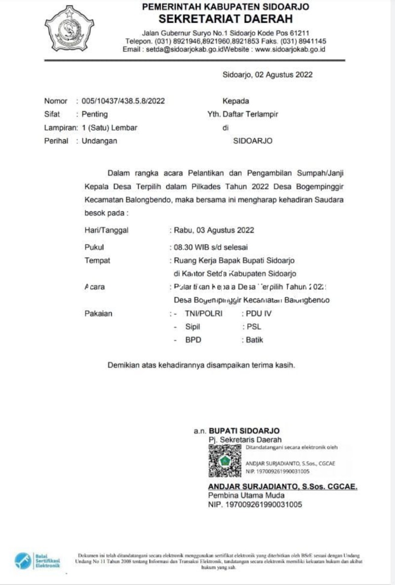 Surat tertanggal 02/08/2022 nomor 005/10437/438.5.8/2022 ini menggunakan kop surat Sekretaris Daerah (Sekda) dan ditandatangani Barcode atas nama a/n Bupati Sidoarjo Pj Sekda Andjar Surjadianto, S.sos. CGCAE (Pembina Utama Muda). Isi surat dalam Rangka Acara Pelantikan dan Pengambilan Sumpah/Janji Kepala Desa Terpilih dalam Pilkades Tahun 2022 Desa Bogempinggir Kecamatan Balongbendo. Maka bersama ini dimohon kehadirannya saudara besok pada Hari/Tanggal Rabu (03/08/2022). Pukul 08.30 WIB s/d selesai. Tempat Ruang kerja Bupati Sidoarjo kantor Setda Bupati Sidoarjo.