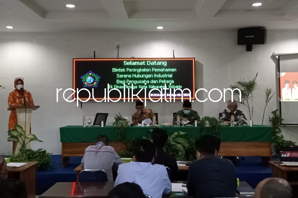 Sidoarjo (republikjatim.com) - Dinas Tenaga Kerja (Disnaker) Pemkab Sidoarjo menggelar Bimbingan Teknis (Bimtek) Peningkatan Pemahaman Hubungan Industrial Bagi Pengusaha dan Pekerja. Acara ini diikuti 45 pekerja dan perusahaan di Aula Kantor Disnaker Pemkab Sidoarjo, Kamis (04/08/2022).