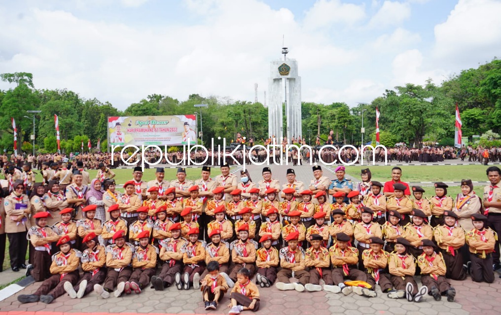 Sidoarjo (republikjatim.com) - Bupati Sidoarjo, Ahmad Muhdlor Ali yang juga Ketua Mabicab Kabupaten Sidoarjo menjadi pembina upacara pelaksanaan apel besar peringatan Hari Pramuka ke 61 Tahun 2022 yang berlangsung di Alun-Alun Sidoarjo, Minggu (14/08/2022). Apel Besar Hari Pramuka Ke 61 diikuti seluruh peserta Pramuka Siaga dan Penggalang seluruh Sidoarjo dengan mengusung tema Mengabdi Tanpa Batas Untuk Membangun Ketangguhan Bangsa.