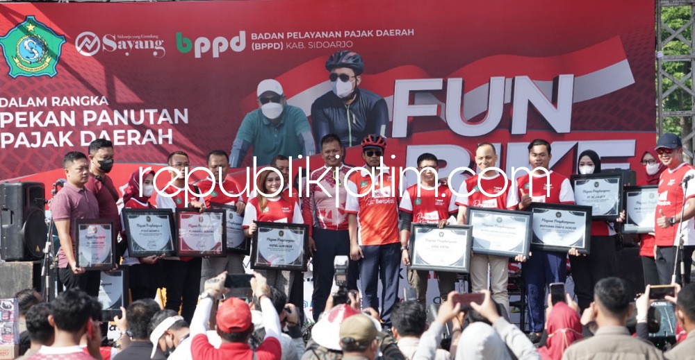 Sidoarjo (republikjatim.com) - Bupati Sidoarjo, Ahmad Muhdlor Ali mengapresiasi para wajib pajak yang tertib dalam membayar pajak. Pemberian penghargaan kepada para wajib pajak panutan itu diserahkan Bupati Sidoarjo yang akrab disapa Gus Muhdlor usai Gowes di Alun-Alun, Sidoarjo, Minggu (22/08/2022).