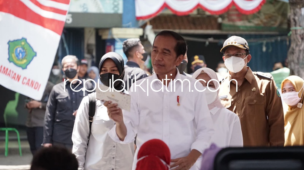 Sidoarjo (republikjatim.com) - Ratusan pedagang dan pengunjung Pasar Larangan, Kecamatan Candi, Kabupaten Sidoarjo dibuat kaget dengan kedatangan Presiden RI Joko Widodo (Jokowi). Kedatangan Jokowi beserta Ibu Negara Iriana Joko Widodo ini dalam rangka membagikan Bantuan Sosial (bansos) sekaligus menyapa para pedagang dan warga Sidoarjo. Senin (22/08/2022).