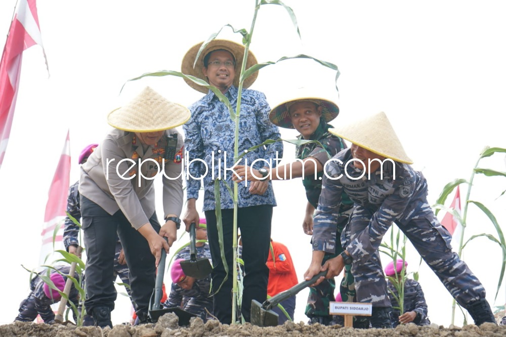 Sidoarjo (republikjatim.com) - Bupati Sidoarjo Ahmad Muhdlor Ali bersama jajaran Pasukan Marinir (Pasmar 2) Gedangan menanam pohon Sorgum dan bibit Jagung jenis hibrida F1, Jumat (09/09/22). Tanam bersama itu sebagai upaya mewujudkan program Ketahanan Pangan Nasional Tahun 2022.