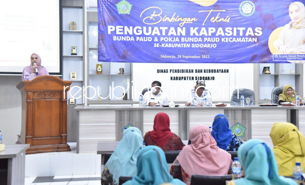 Sidoarjo (republikjatim.com) - Puluhan Bunda Pendidikan Anak Usia Dini (PAUD) tingkat kecamatan se Kabupaten Sidoarjo mengikuti Bimtek penguatan kapasitas Bunda PAUD yang diselenggarakan Pokja Bunda PAUD Kabupaten Sidoarjo, Rabu (28/09/2022). Kegiatan yang dibuka Bunda PAUD Kabupaten Sidoarjo, Ny Sa'adah Ahmad Muhdlor ini digelar di Aula Dinas Pendidikan dan Kebudayaan Pemkab Sidoarjo.