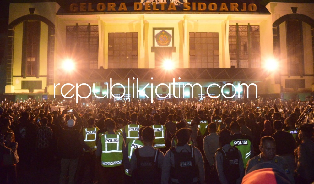 Sidoarjo (republikjatim.com) - Ribuan warga Sidoarjo tumplek blek di depan Stadion Gelora Delta Sidoarjo, Selasa (04/10/2022) malam. Di halaman stadion kebanggaan arek Sidoarjo ini dipenuhi suporter Delta Mania, Bonek Mania dan masyarakat umum.