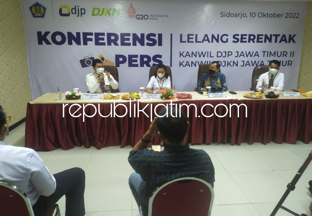 Sidoarjo (republikjatim.com) - Kantor Wilayah Direktorat Jenderal Pajak (Kanwil DJP) Jawa Timur II menyelenggarakan Lelang Serentak Eksekusi atas aset sitaan. Kegiatan ini bekerja sama dengan Kanwil Direktorat Jenderal Kekayaan Negara (DJKN) Jawa Timur. Lelang serentak ini merupakan kegiatan kali pertama digelar di wilayah Jawa Timur, Senin (10/10/2022).