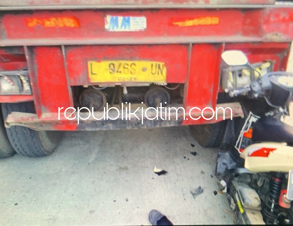 "Kronologisnya, semula truk kontainer bernopol L 9468 UN berhenti di jalan sisi kiri dari arah barat menuju timur. Saat itu, sopir hendak tanya alamat pergudangan. Setelah itu, sopir kembali ke truk mendadak dari belakang suara benturan kendaraan dari arah barat menuju timur sepeda motor Yamaha Mio bernopol W 6288 RJ menabrak ban sisi kanan turk. Akibatnya, sepeda motor masuk di tengah ban hingga korban terjatuh di sisi kanan itu," ungkapnya.