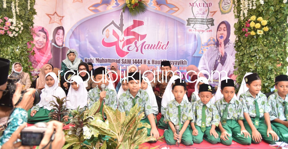 Sidoarjo (republikjatim.com) - Maulid Nabi Muhammad SAW diperingati MI Bilingual Roudlotul Jannah, Desa Kajartengguli, Kecamatan Prambon, Sidoarjo di halaman sekolahnya, Rabu (12/10/2022). Peringatan hari lahirnya nabi besar Muhammad SAW ini diikuti ratusan ibu-ibu jamaah. Wakil Bupati Sidoarjo, Subandi beserta istri dr Sriatun ikut hadir dalam acara itu.