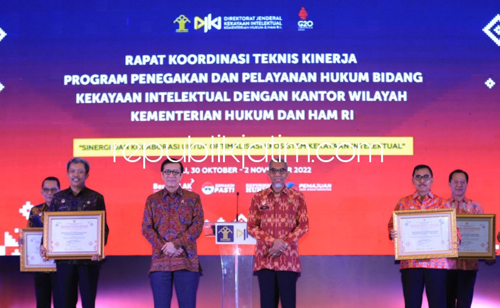 Penghargaan itu disampaikan secara simbolis dalam Rapat Koordinasi Teknis Kinerja Program Penegakan dan Pelayanan Hukum Bidang Kekayaan Intelektual di Hotel Anvaya Beach Resort Bali, Senin (31/10/2022). Menteri Hukum dan HAM Yasonna Laoly memberikan penghargaan kepada Kantor Wilayah yang berprestasi dalam pelaksanaan kinerja Bidang KI.