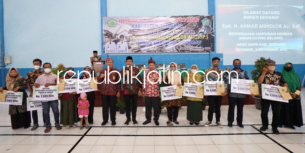 Sidoarjo (republikjatim.com) - Puluhan guru dan siswa SMP Negeri se Kabupaten Sidoarjo yang menjadi korban amukan angin puting beliung mendapatkan bantuan dari Musyawarah Kerja Kepala Sekolah (MKKS) SMP Negeri Sidoarjo. Secara simbolis bantuan itu diserahkan Bupati Sidoarjo Ahmad Muhdlor Ali di Aula SMPN 2 Sidoarjo, Kamis (03/11/2022).