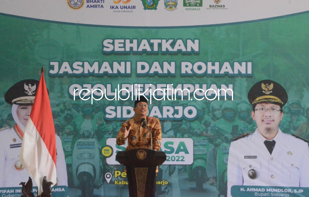 Sidoarjo (republikjatim.com) - Kolaborasi Ikatan Alunmi (IKA) Unair Surabaya, Pemkab Sidoarjo dan Muslimat NU Sidoarjo menggelar Bakti Sosial (Baksos) untuk Ojek Online (Ojol) perempuan di Sidoarjo. Baksos ini digelar di Pendopo Delta Wibawa, Sidoarjo, Selasa (08/11/2022).