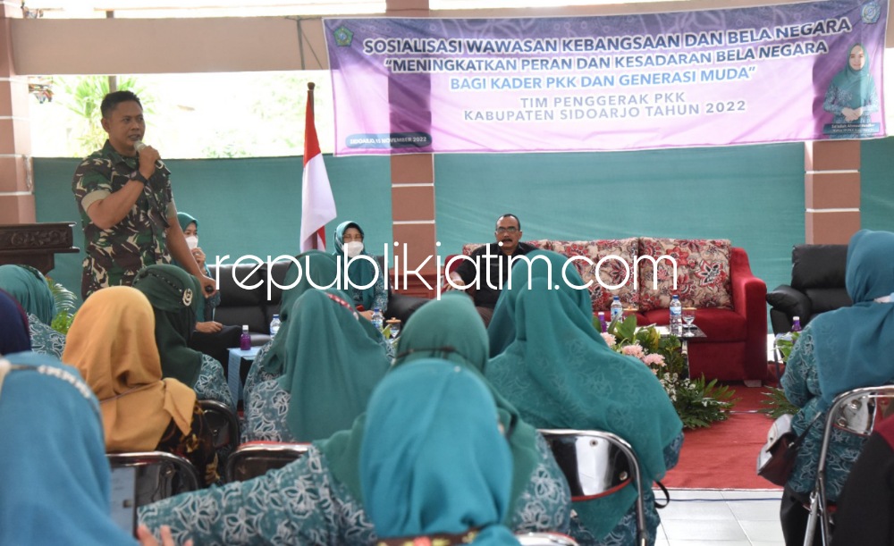 Sidoarjo (republikjatim.com) - Sebagai upaya meningkatkan peran dan kesadaran bela negara kepada kader PKK dan generasi muda, TP PKK Kabupaten Sidoarjo menggelar Sosialisasi Wawasan Kebangsaan dan Bela Negara. Organisasi kemasyarakatan yang diketuai istri Bupati Sidoarjo, Ny Sa'adah Ahmad Muhdlor ini menggelar sosialisasi di Pendopo Kantor Kecamatan Sidoarjo, Selasa (15/11/2022).
