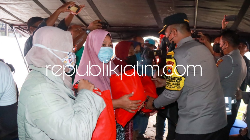 Dalam kesempatan meninjau layanan vaksinasi Covid-19 di gerai vaksin Taman Pinang Indah, Kapolresta Sidoarjo juga membagikan 300 paket sembako kepada masyarakat. Zak/Waw