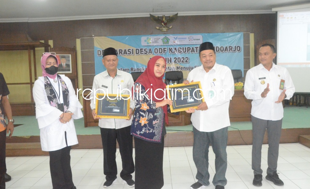 Desa ODF di Kabupaten Sidoarjo mendapatkan sertifikat dari Pemkab Sidoarjo. Penyerahan secara simbolis diserahkan langsung Ketua TP PKK Kabupaten Sidoarjo, Sa'adah Ahmad Muhdlor pada kegiatan Deklarasi Desa ODF Kabupaten Sidoarjo Tahun 2022 di Delta Graha Setda Kabupaten Sidoarjo, Rabu (23/11/2022).