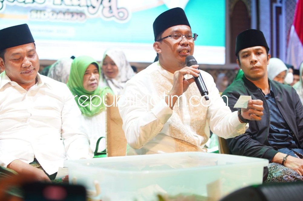 "Sampean cinta kepada rasulullah dengan jenengan bershalawat. Saya yakin urusan moral generasi yang akan datang akan beres. Indonesia akan aman, Sidoarjo akan aman, Jawa Timur akan aman dan insyaallah kedamaian ada dimana-mana," ujar Bupati muda yang akrab disapa Gus Muhdlor ini.