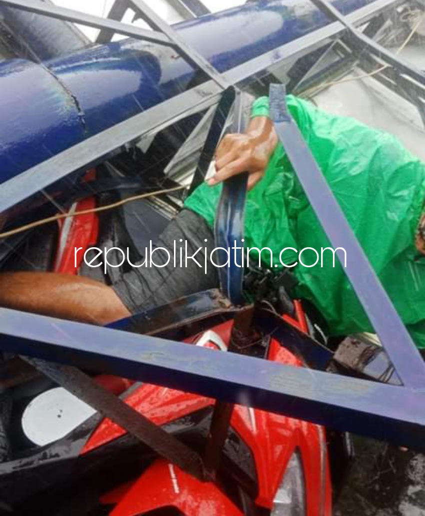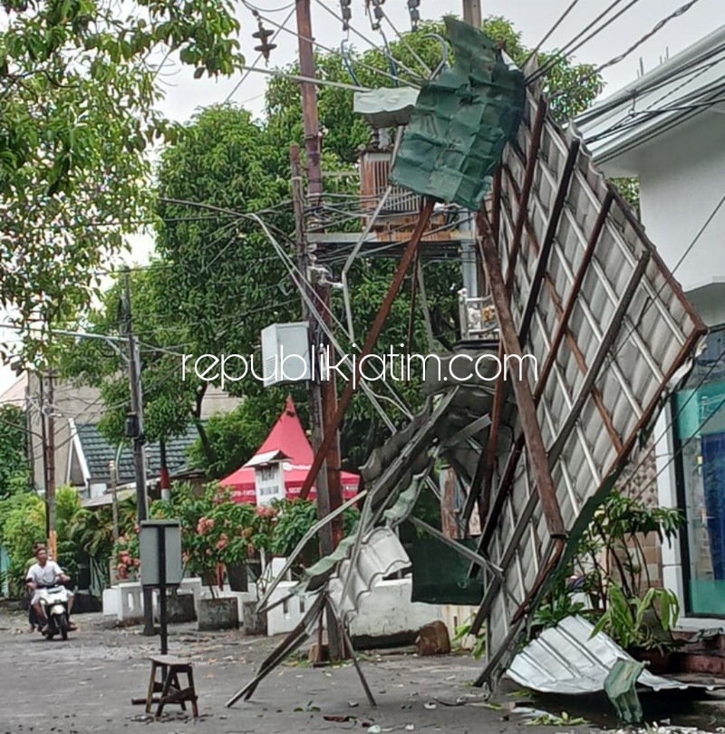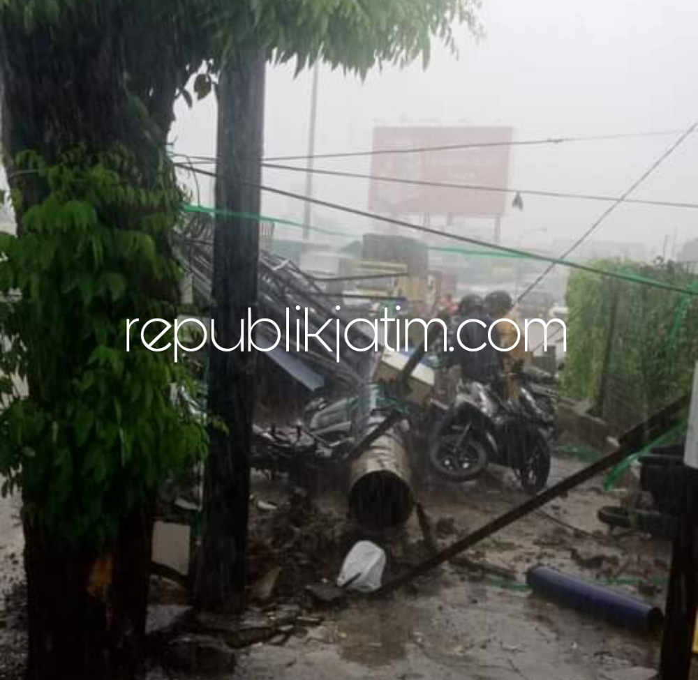 Sidoarjo (republikjatim.com) - Hujan deras disertai angin kencang yang mengguyur wilayah Sidoarjo utara dan sekitarnya disertai menyebabkan sejumlah kerusakan warung dan rumah warga di Desa Pepelegi, Kecamatan Gedangan, Sidoarjo. Selain itu, amukan angin kencang itu juga menyebabkan seorang sebuah papan reklame berukuran raksasa ambruk menimpa seorang pengendara motor dan sebuah mobil pikup.