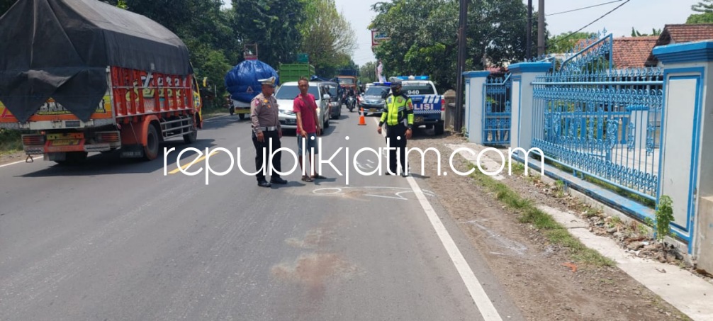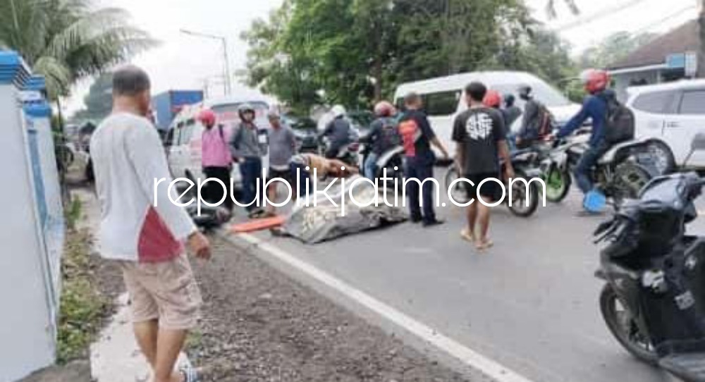 Sidoarjo (republikjatim.com) - Kecelakaan maut kembali terjadi. Kali ini, seorang pengendara motor (pemotor) menyenggol pengendara motor lain. Akibatnya, salah seorang pemotor meninggal dunia di lokasi kejadian usai terlindas truk saat korban terpental di aspal JL Raya Surabaya - Mojokerto, Desa Bakungtemenggungan, Kecamatan Balongbendo, Sidoarjo, Senin (16/01/2023).