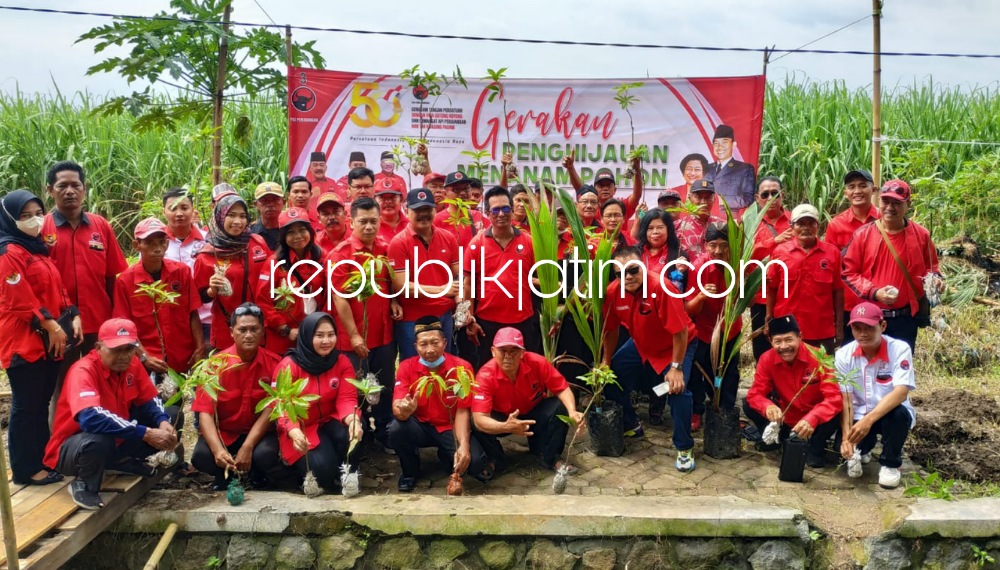 Sidoarjo (republikjatim.com) - Para pengurus dan kader DPC PDI Perjuangan Kabupaten Sidoarjo menggelar acara penghijauan. Acara itu dikemas dengan menanam 1.000 pohon kelapa dan mangga di sepanjang aliran sungai Desa Kedinding, Kecamatan Tarik, Sidoarjo, Sabtu (28/01/2023).