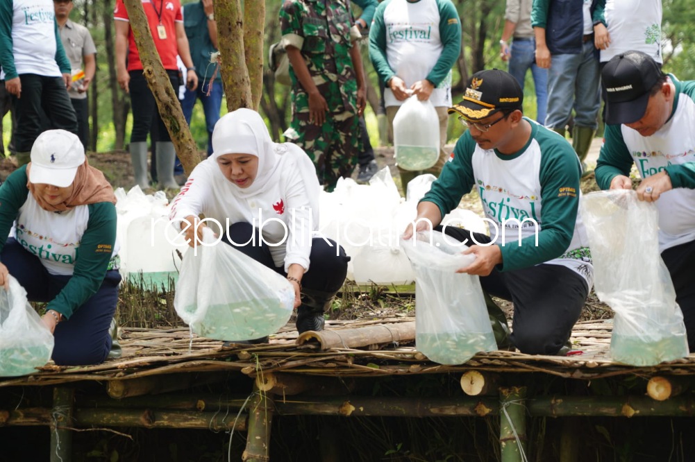 Acara yang dipimpin Gubernur Jatim Khofifah Indar Parawansa ini didampingi Deputi Bidang Koordinasi Pengelolaan Lingkungan dan Kehutanan Kemenko Marvest, Nani Hendiarti dilakukan yakni dengan melangsungkan penanaman 1.000 bibit mangrove dan bibit pohon produktif.