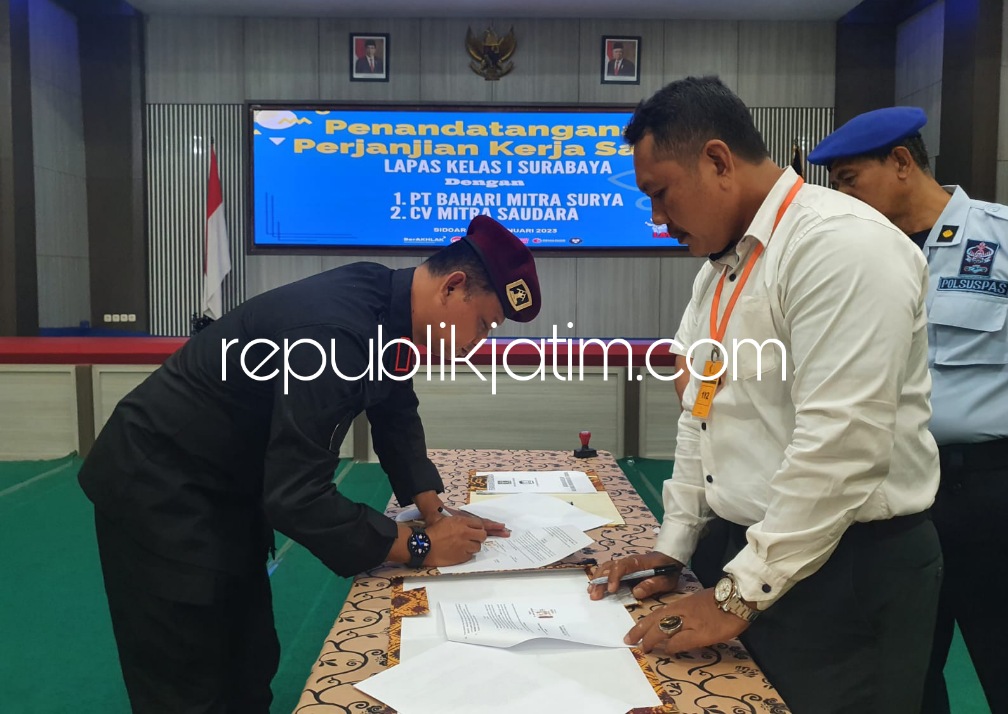 Sidoarjo (republikjatim.com) - Dalam rangka mengembangkan potensi, minat, bakat, ketrampilan, kewirausahaan dan keprofesian Warga Binaan Pemasyarakatan (WBP) atau narapidana Lapas Kelas I Surabaya di Desa Kebonagung, Kecamatan Porong, Sidoarjo melaksanakan penandatanganan perjanjian kerja sama dengan (MoU) dengan tiga mitra kerja sekaligus, (31/01/2023). Kegiatan penandatanganan perjanjian kerja sama atau MoU itu dilaksanakan di Aula MD Arifin dan dihadiri seluruh bidang Kegiatan Kerja, mitra dan para saksi.