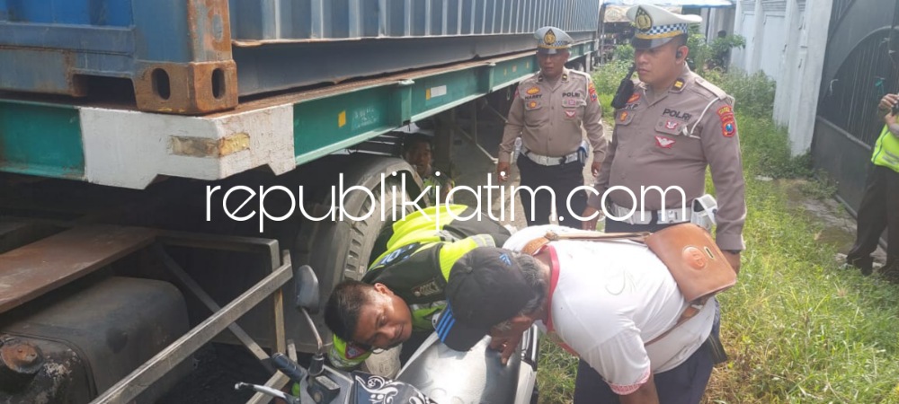 "Kronologisnya semula sepeda motor Honda bernopol L.3290 RN berjalan dari arah barat (Mojokerto) menuju timur (Surabaya). Sesampainya di TKP, motor berusaha mendahului truk kontainer bernopol S 9725 UB yang berada di depannya dari sisi kiri. Saat melewati bahu jalan yang kondisi jalan lebih tinggi dari jalan aspal, motor korban oleng dan terjatuh. Akibatnya, pengendara motor jatuh ke kanan hingga terlindas ban kiri belakang truk kontainer yang berjalan dari arah sama yakni dari barat ke timur itu," ungkapnya.