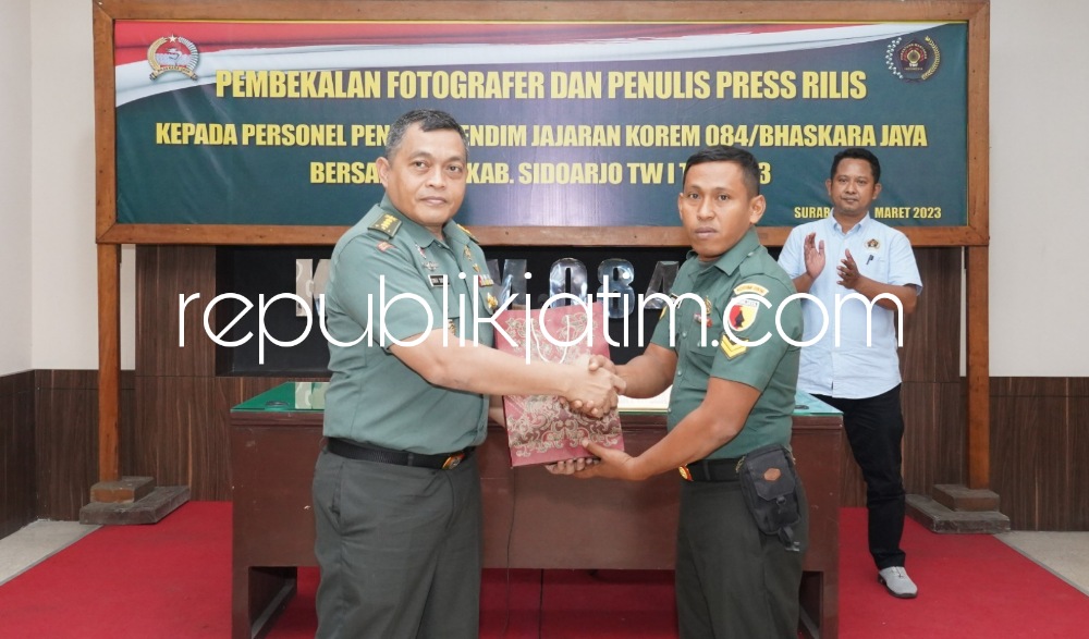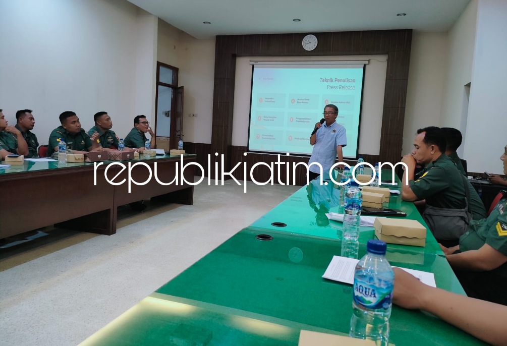 Sidoarjo (relublikjatim.com) - Korem 084/Bhaskara Jaya menggelar pelatihan jurnalistik bagi puluhan anggota Penerangan Kodim (Pendim) jajaran Korem 084/Bhaskara Jaya dan anggota Penerangan Korem (Penrem) 084/Bhaskara Jaya, di Ruang Data Makorem 084/Bhaskara Jaya, JL Ahmad Yani Nomor 1 Surabaya, Kamis (09/03/2023). Pembekalan ilmu jurnalistik berupa teknik membuat press release dan fotografi jurnalistik ini menghadirkan dua narasumber dari Persatuan Wartawan Indonesia (PWI) Kabupaten Sidoarjo.
